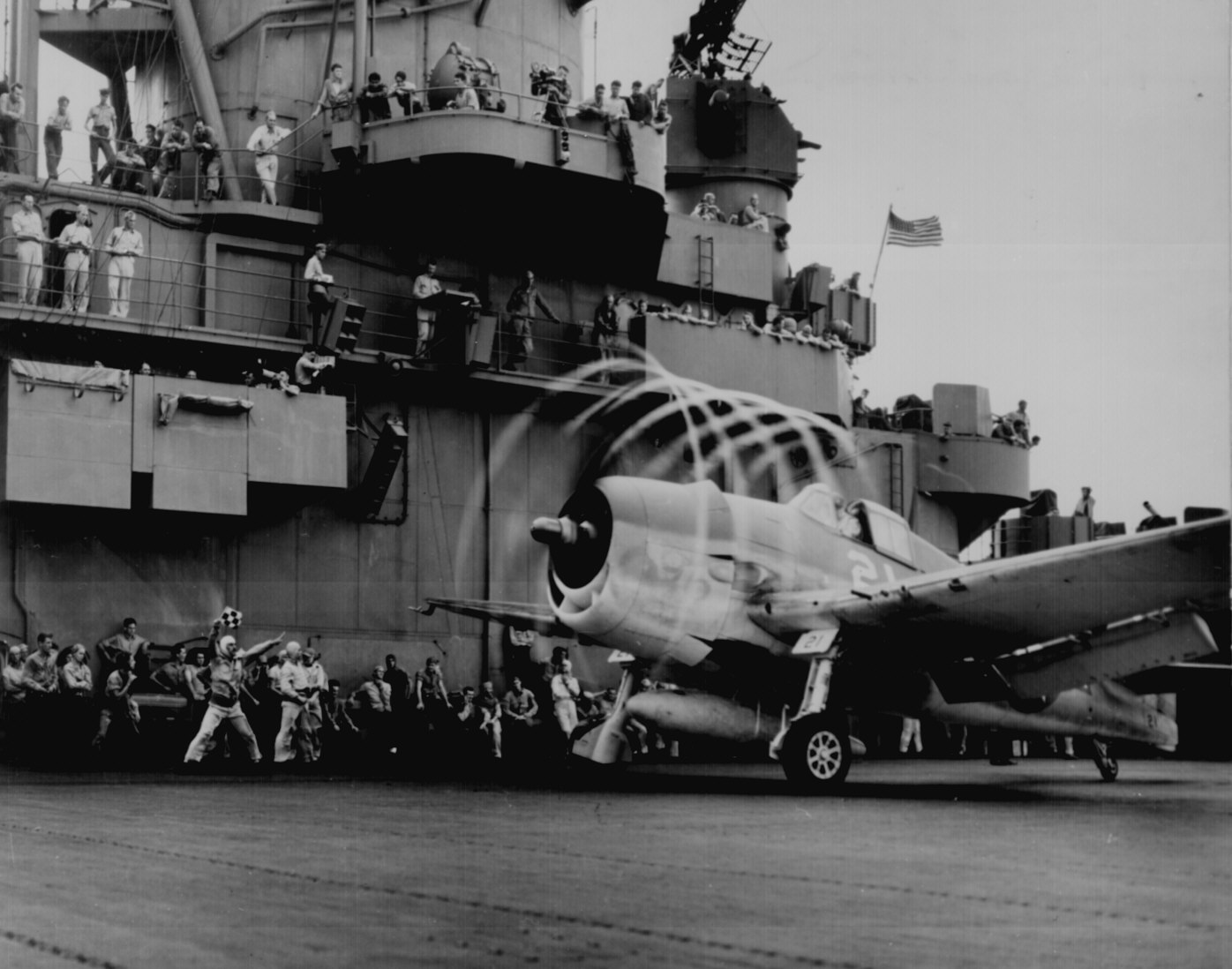 | Foto: Nº70, galería: Aviation. "Dynamic static. The motion of its props causes an `aura' to form around this F6F on USS YORKTOWN. Rotating with blades, halo moves aft, giving depth and perspective." November 1943. 80-G-204747A. (ww2_70.jpg) |